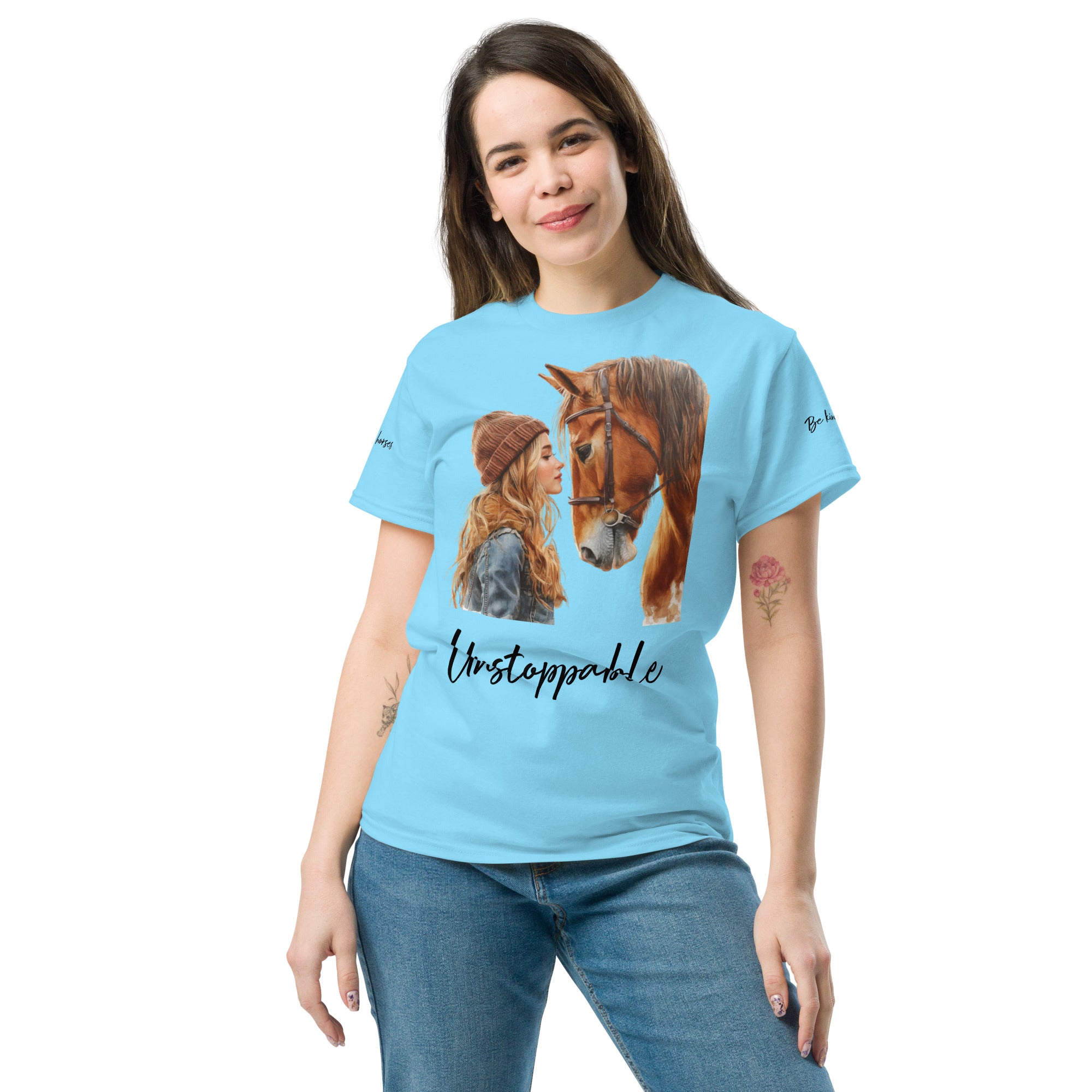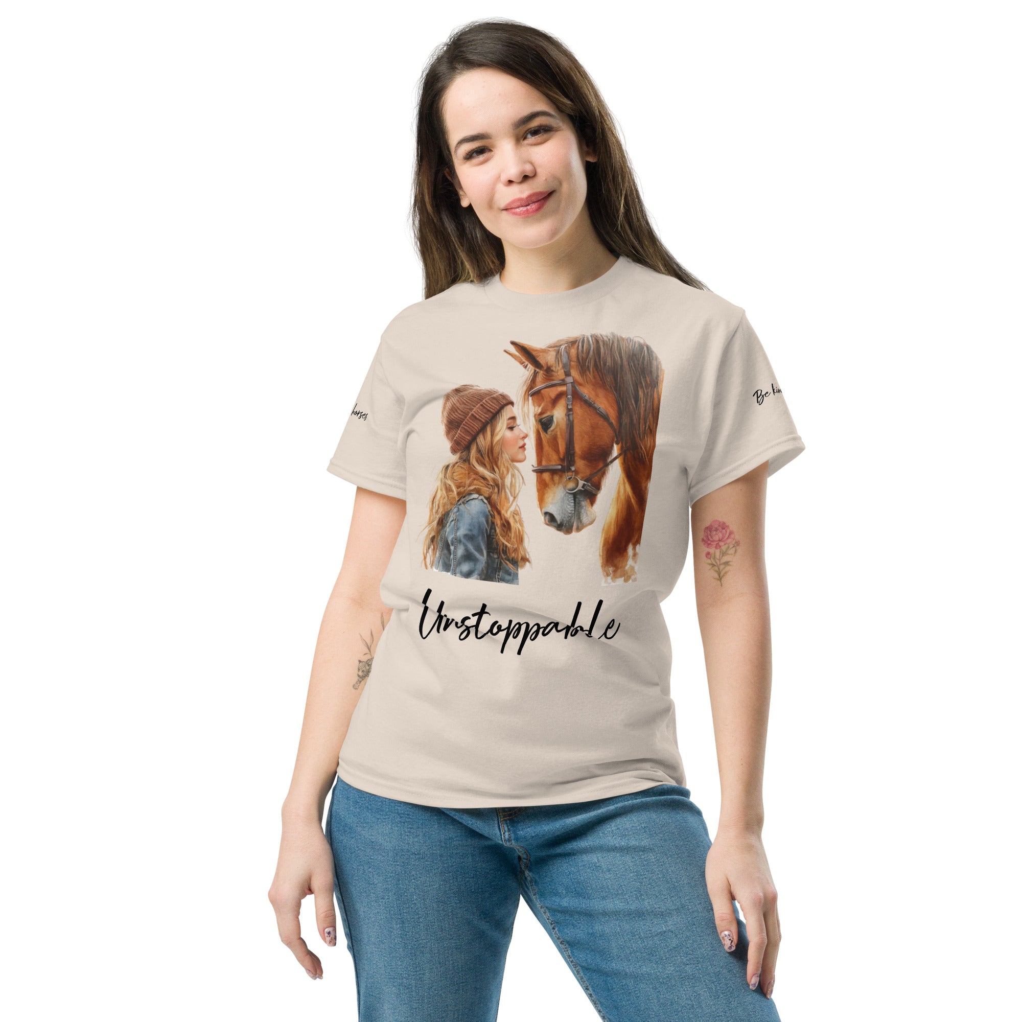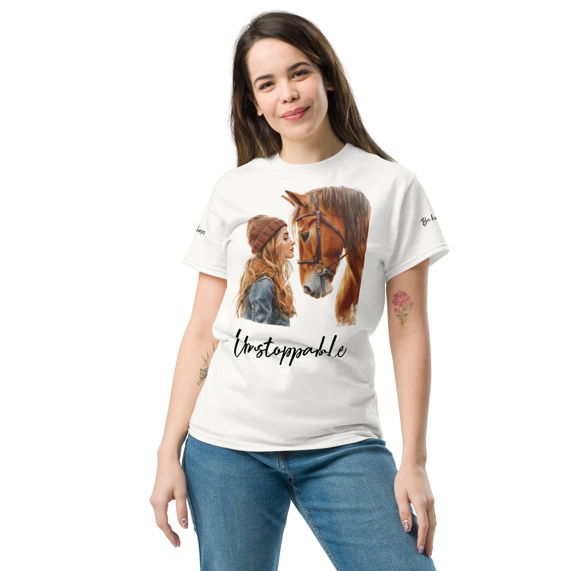 This special edition “Be Kind to Horses” T-shirt honors the deep, unspoken connection between humans and horses. Featuring the same beloved design as our best-selling hoodie—a girl and her horse sharing a quiet moment of unity—it’s more than just a shirt. It’s a movement of compassion.