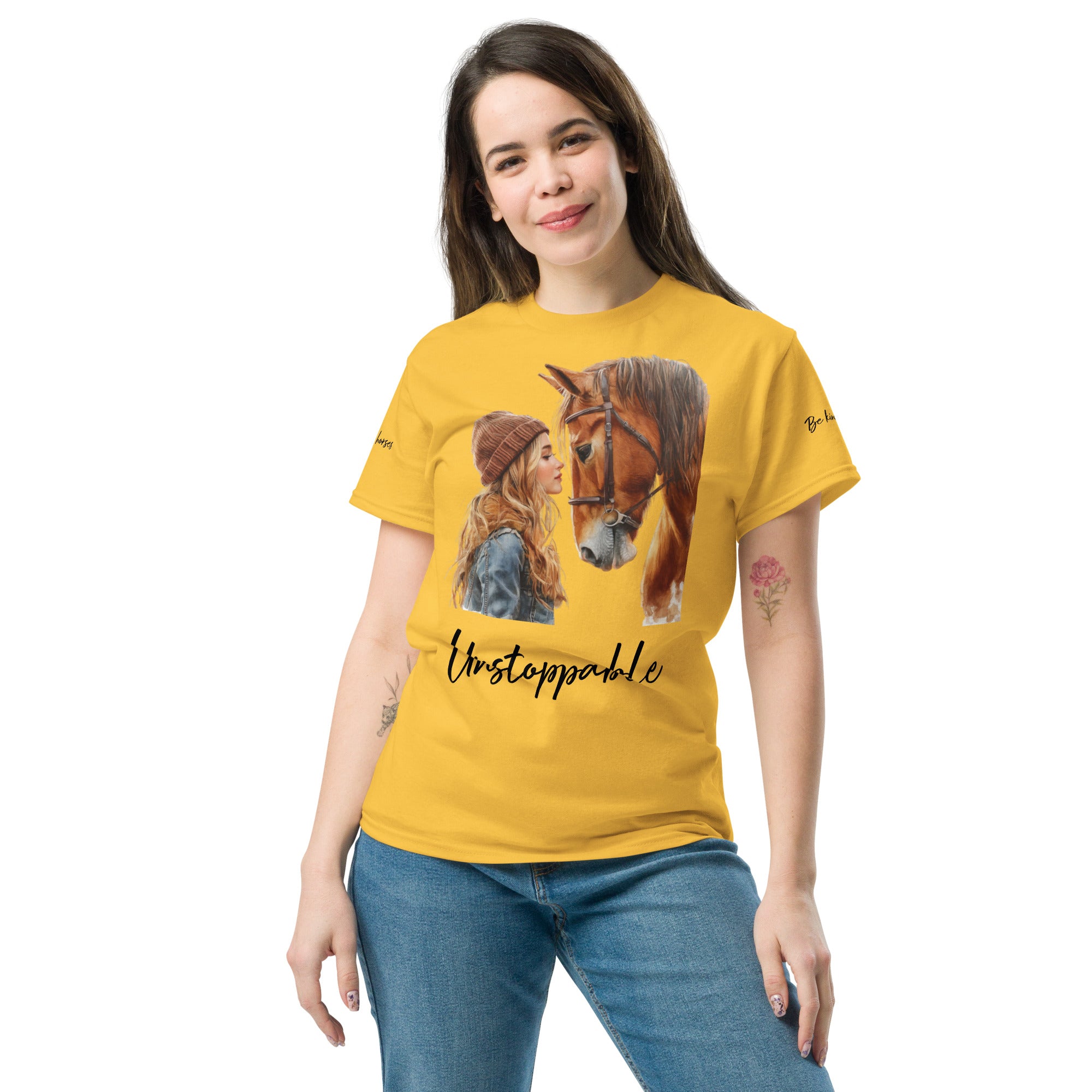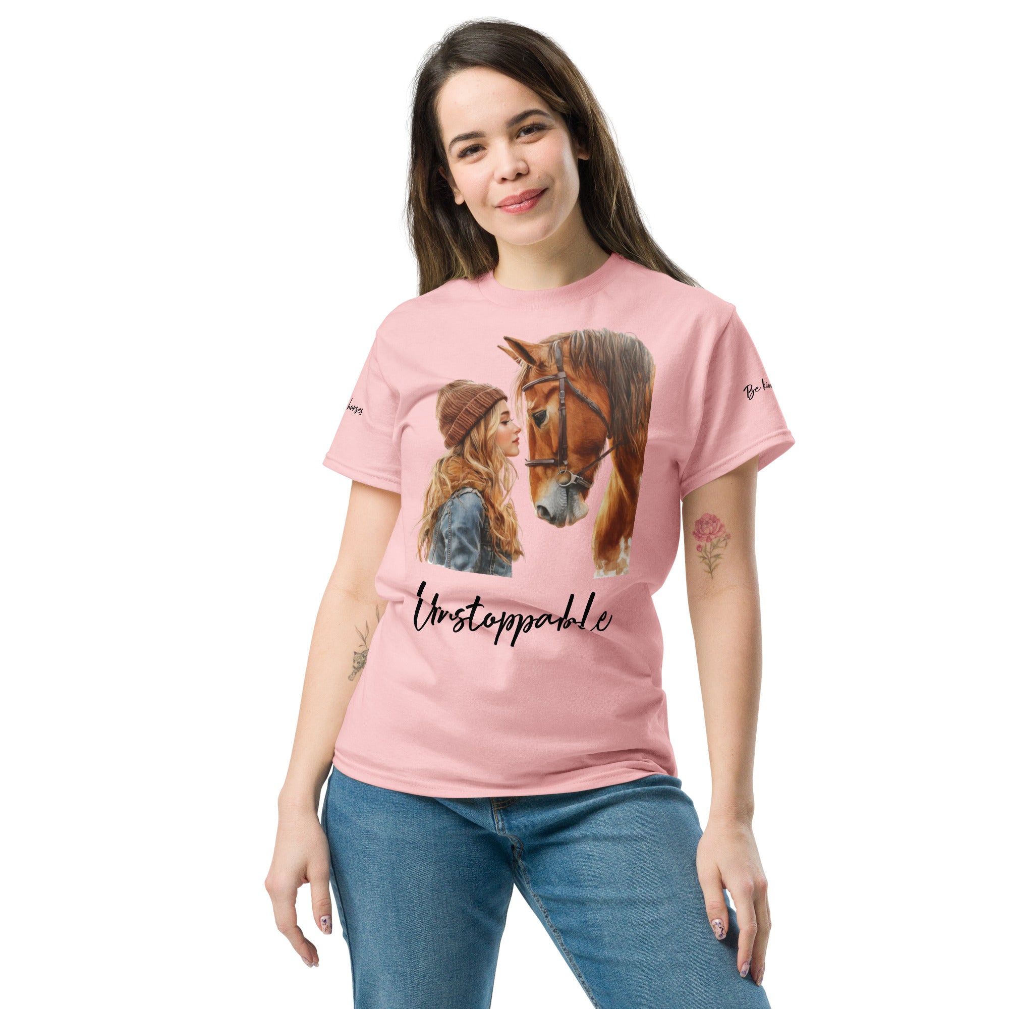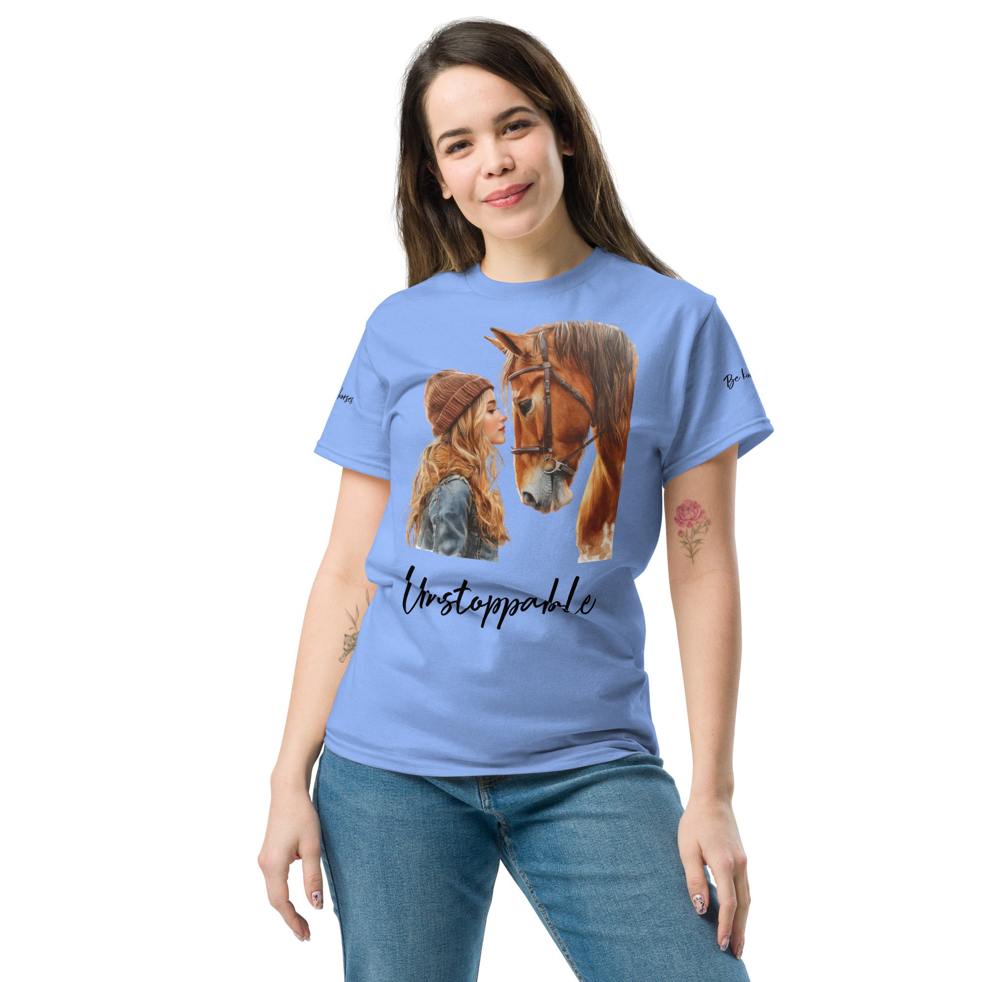 This special edition “Be Kind to Horses” T-shirt honors the deep, unspoken connection between humans and horses. Featuring the same beloved design as our best-selling hoodie—a girl and her horse sharing a quiet moment of unity—it’s more than just a shirt. It’s a movement of compassion.
