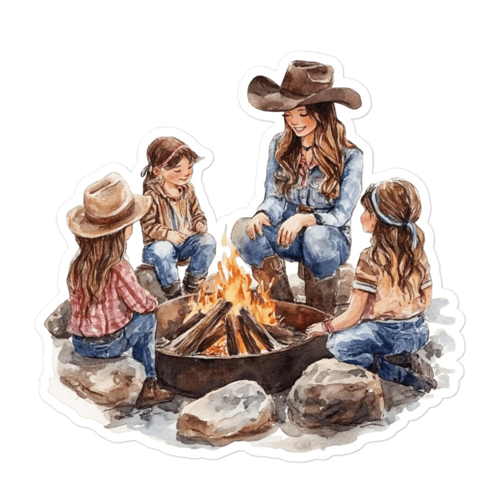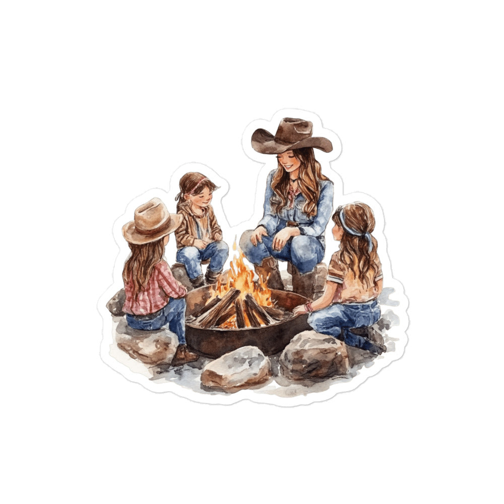 Cozy campfire vibes, Western style. This durable vinyl sticker features a cowgirl and kiddos gathered around the fire—perfect for water bottles, tack trunks, laptops, journals, and gift bags.