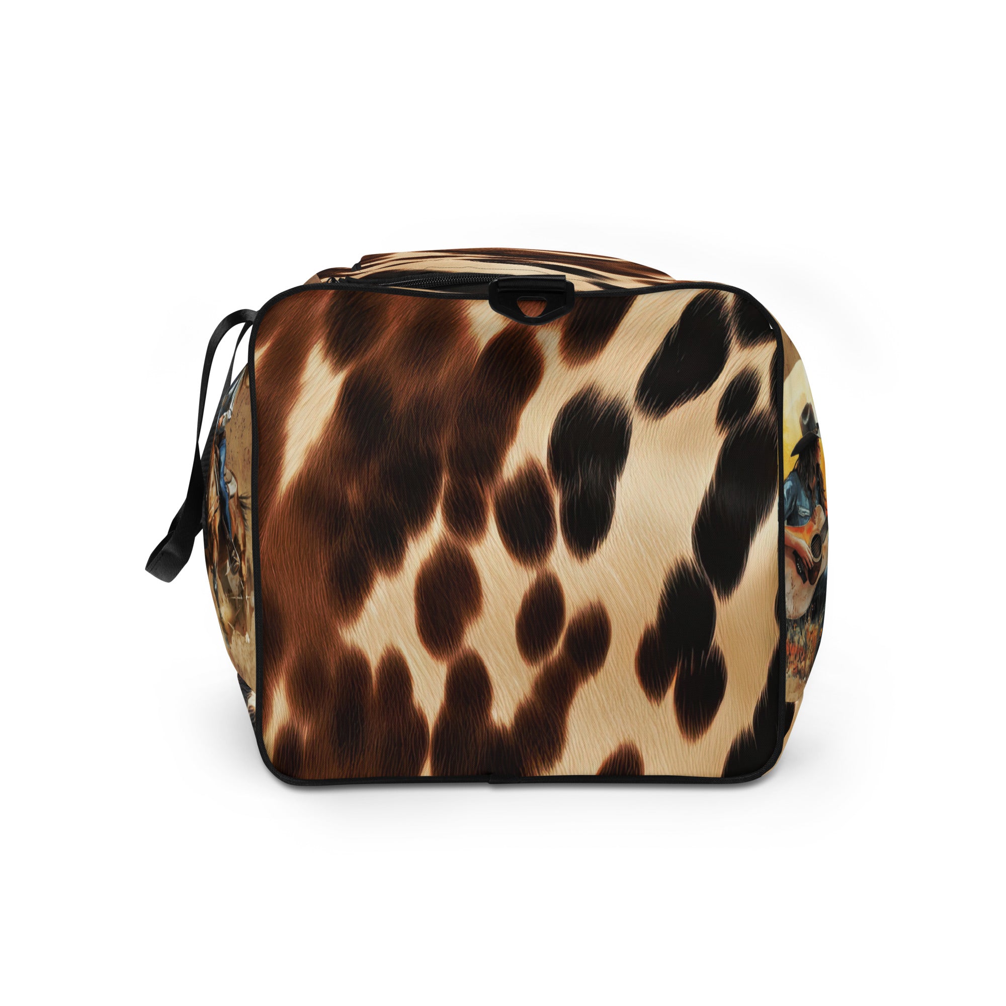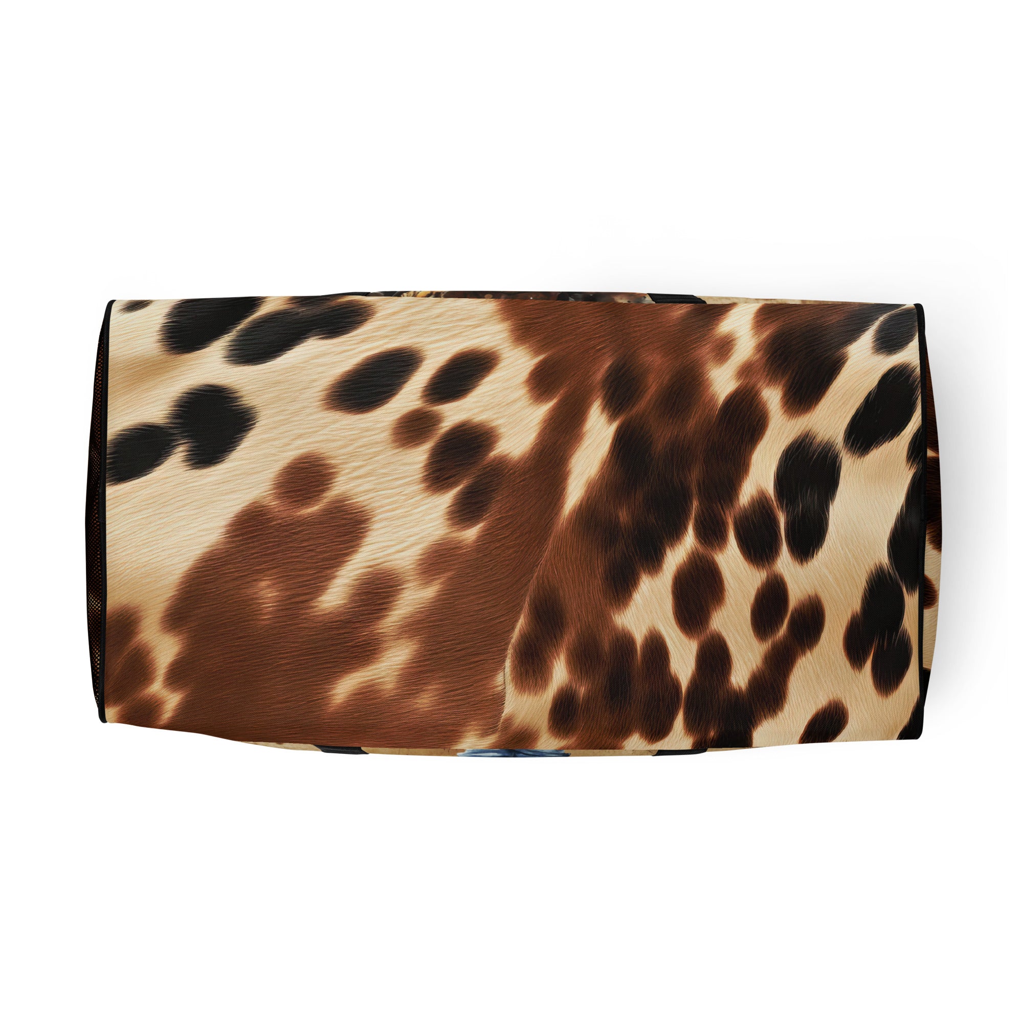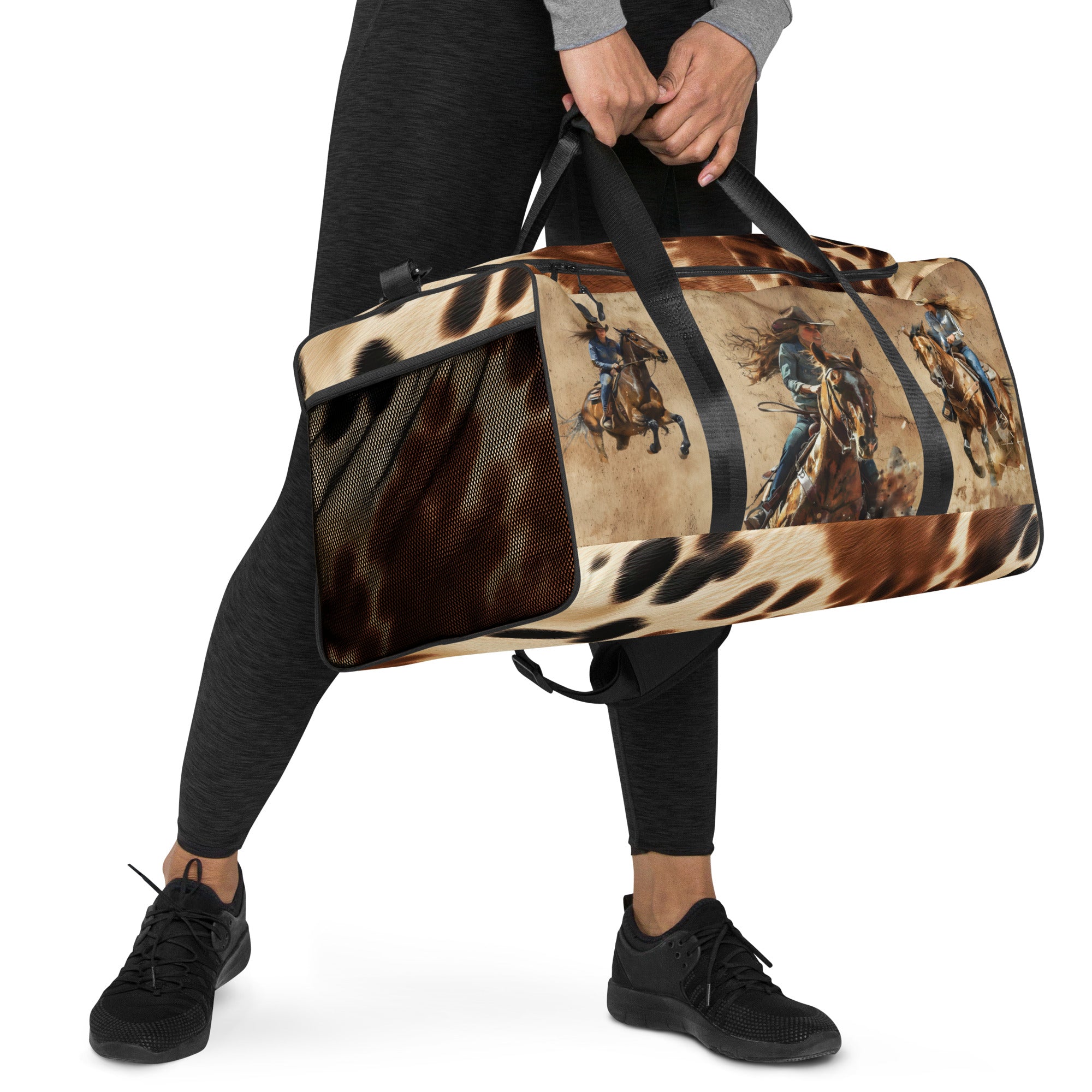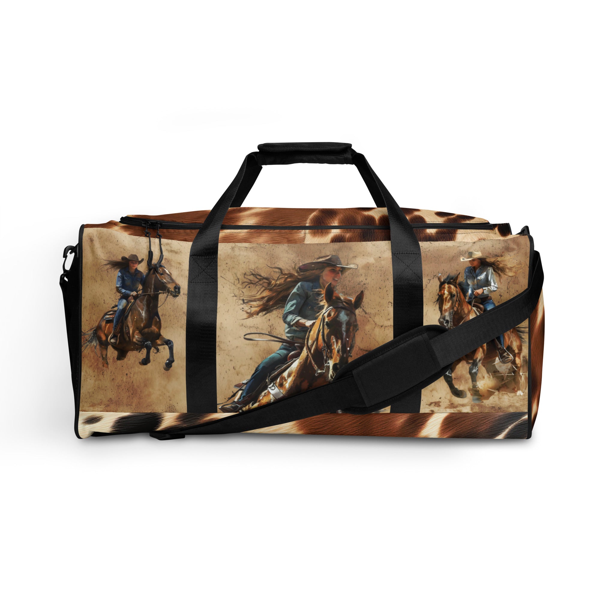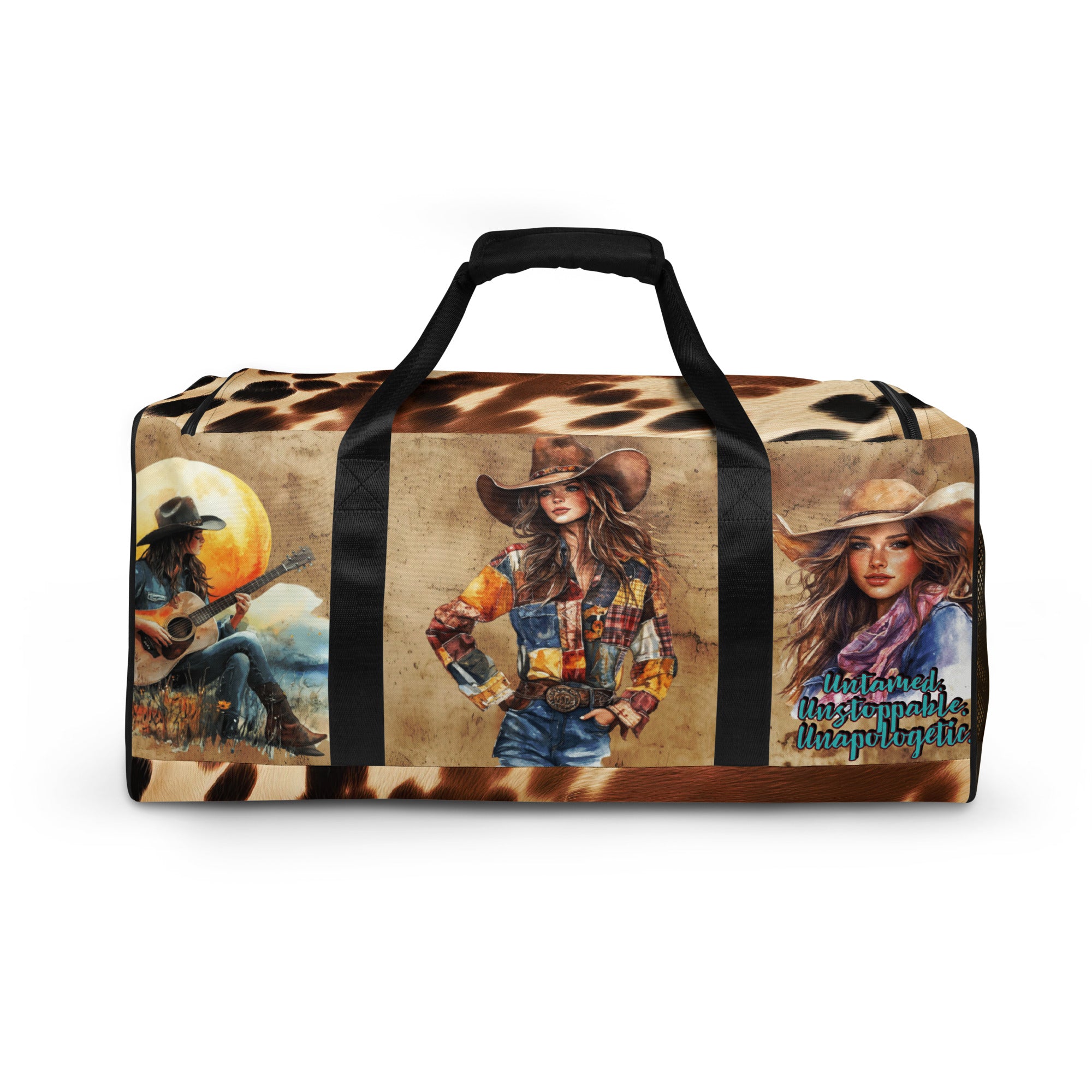 Make every getaway a statement. This 22″ western duffle features bold cowhide accents with full-color cowgirl artwork on both sides—including the motto “Untamed. Unstoppable. Unapologetic.” Roomy, durable, and comfortable to carry, it’s built for weekends, barn days, and the gym.