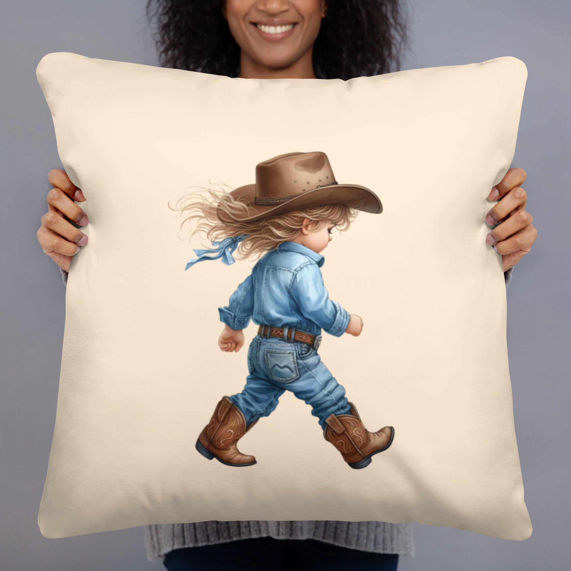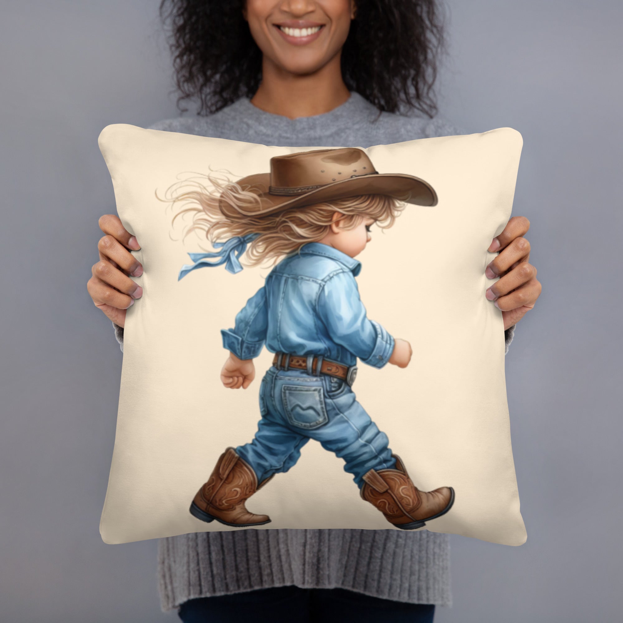 Add a touch of western charm to any space with this Little Cowgirl Pillow. Featuring an adorable young cowgirl in classic denim, boots, and a wide-brimmed hat, this design captures the free-spirited heart of country living. The soft, durable cover and vivid print make it both a stylish accent and a cozy companion — perfect for ranch homes, nurseries, or anyone who loves cowboy culture.