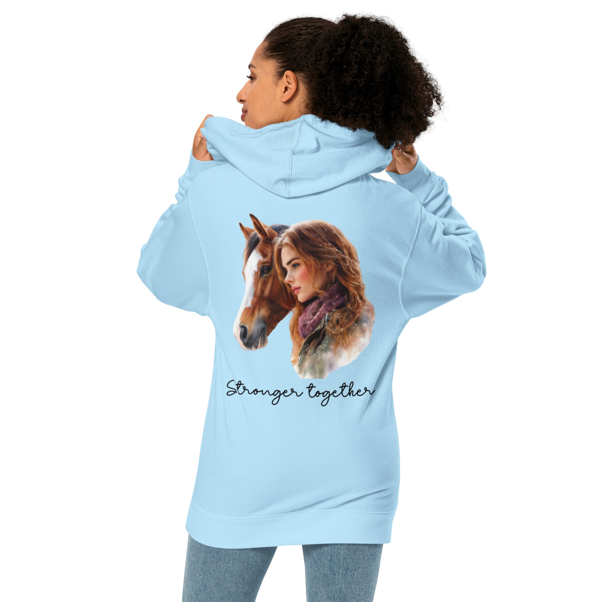 Horses don’t just teach us how to ride—they teach us how to heal, how to trust, and how to find strength in the quiet moments. Stronger together is more than just a hoodie; it’s a reminder that even in life’s toughest storms, the connection with a horse can ground us, guide us, and help us rise again.